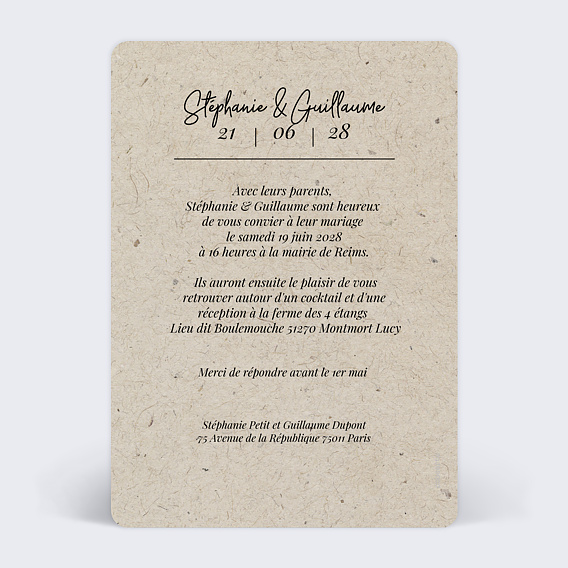 Personnalisez votre faire-part mariage Esprit Chiné II, disponible en coins ronds ou carrés.